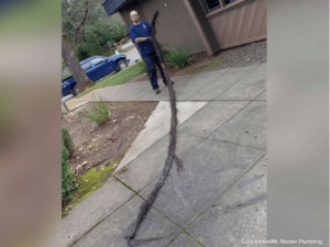 Speaking of tree roots…this is one of the most common causes of blockages in sewer lines. While this one pictured is huge, most damage is caused by small “shoots” that make their way into drain pipes. If you notice a difference in your drains, we can inspect with a camera to rule out the worst…clearing your clog or blockage fast.